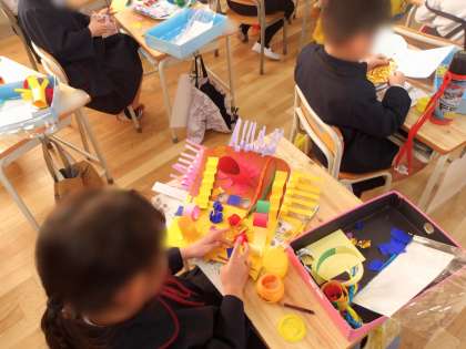 1年生はお面づくりをしています。これまで学習した紙を使った飾りつけを駆使してオリジナルのお面を制作しています。配色や紙の曲げ方、切り方に工夫が見られます。