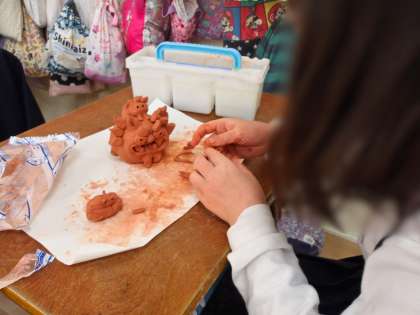 5年生も社会科で学習した沖縄のくらしから、沖縄でよく見るシーサーを制作しています。それぞれの表情が違っていて素敵です。