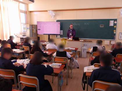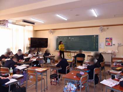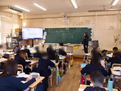 5年生は英語の学習です。地図を見ながら"Where is 〜?"という問いに対して、英語で答える練習をしました。