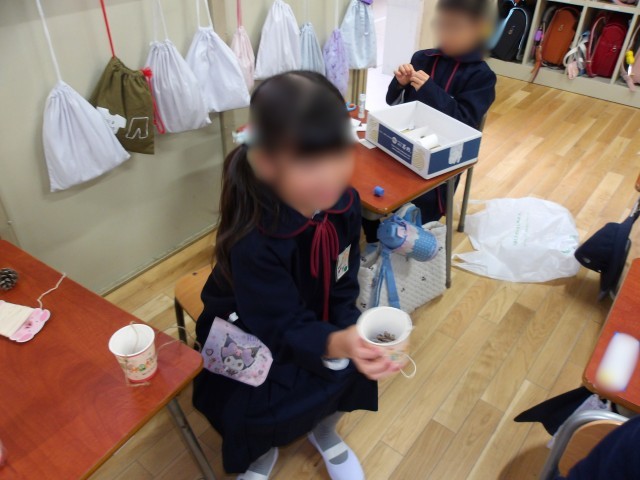 1年生は生活の学習です。秋見つけで拾ったどんぐりや松ぼっくりをつかっておもちゃ作りをしました。