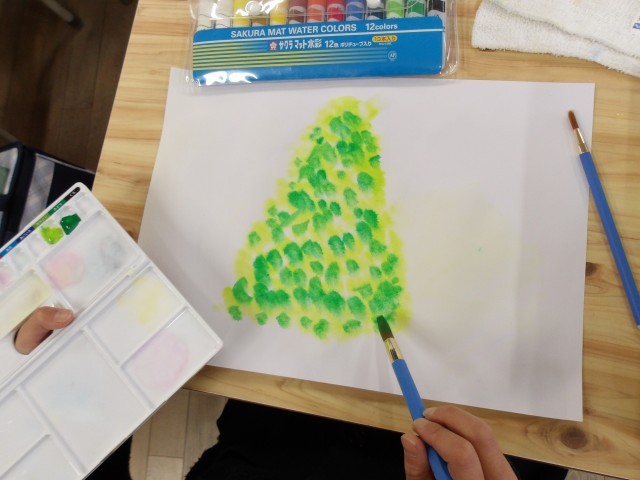 水と絵の具を使ってクリスマスツリーを描いています。画用紙を水で濡らし、その上に絵の具で描いていきました。画用紙が水を含んでいるので、「にじみ」や「混ざり合い」がとってもきれいに広がります。