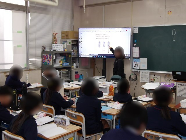 4年生は算数で「変わり方」の学習をしています。ばねばかりに吊り下げたおもりの重さとばねの伸びのようにいくつかの例を挙げ、伴って変化する2つの量について学習することを確かめました。