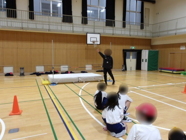 6年生は体育の学習です。中央区で実施している体力向上推進事業からゲストティーチャーに来ていただき、走り高跳びについてより専門的に教えていただきました。