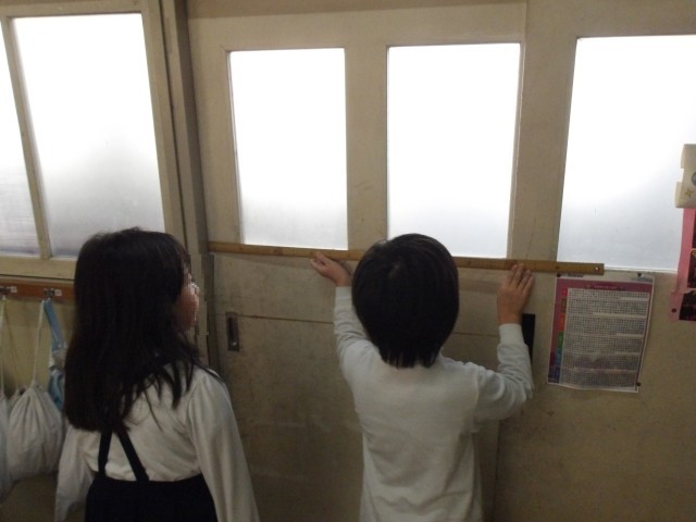 算数科で、「長い長さをはかろう」の学習をしています。この学習では1mものさしを使って色々なものの長さをはかります。ドアの縦横の長さ、オルガンの端から端まで、机の縦、横、ななめ、高さなど、様々な場所をはかりました。子ども達は、1mものさしを使うと、短いものさしでは計るのが大変な場所の長さを、簡単に計ることができることに気づきました。