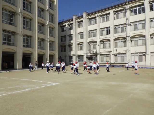 4クラス合同体育で、色々なルールのドッジビーを行いました。コートを変形させたり、ドッジビーの数を増やしたりして、いつもとは少し違ったドッジビーを楽しむことができました。