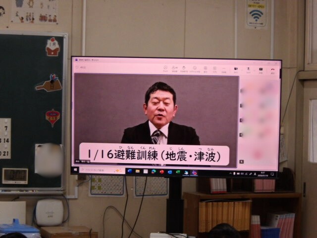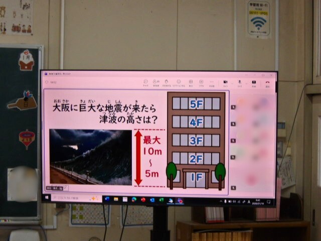 「地震はどうして起きるのでしょうか?それは地球がうごいているからです。大地が動くことによって、歪みが生まれ、それが地震・津波になります。また、大阪市には5~10mの津波が来ることが予想されるので、建物の4階以上に避難しましょう。」とお話がありました。今後30年以内に南海トラフ地震が起こる可能性が高いといわれています。先週の避難訓練をふり返って、地震・津波の避難の仕方をしっかり心に留めて安全・安心な学校生活を過ごしていきましょう。
