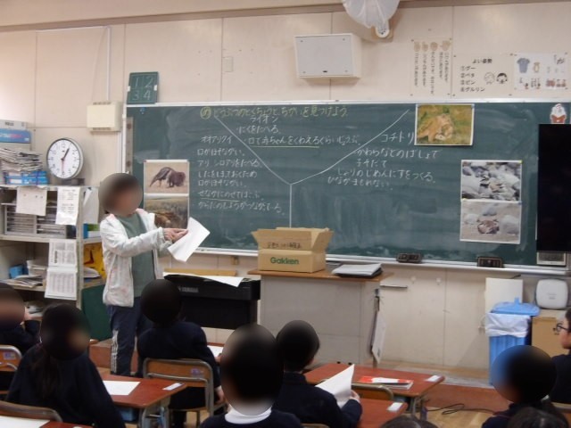 1年生は国語の説明文「子どもをまもるどうぶつたち」の学習です。これまで学習してきた、ライオン、大アリクイ、コチドリの特徴と違いをYチャートをつかって整理していきました。