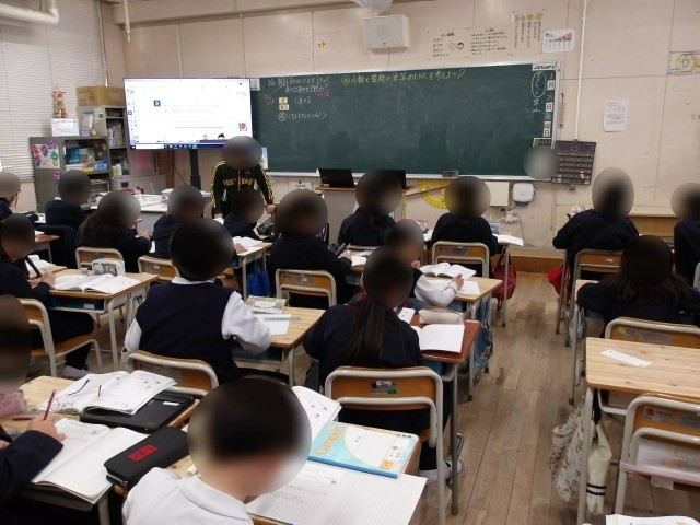 4年生は算数「小数のかけ算」の学習です。1.8mの机が3脚あるとき、全部の長さを求める式、1.8×3を筆算でする方法を考えました。小数のかけ算の筆算も整数と同じようにできますが、小数点はどのようにするか交流しました。
