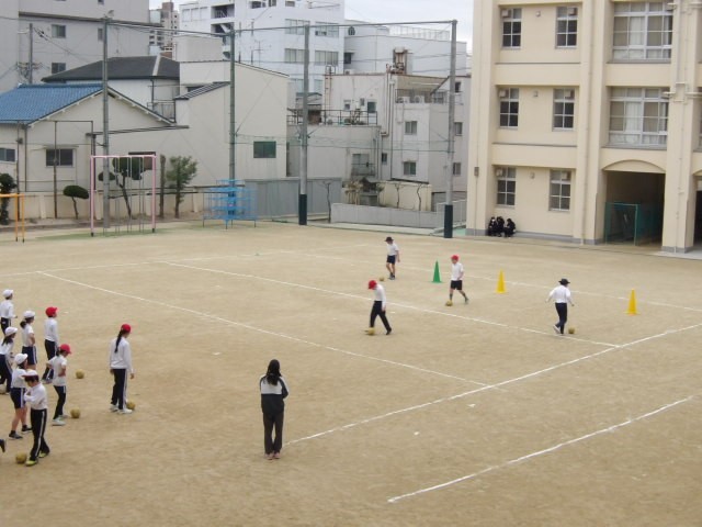 5年生は体育の学習です。初めに持久走をしました。寒いですが、走ると体があたたかくなりますね。持久走の後は、サッカーの練習です。サッカーボールを足で扱うドリブルを練習しました。
