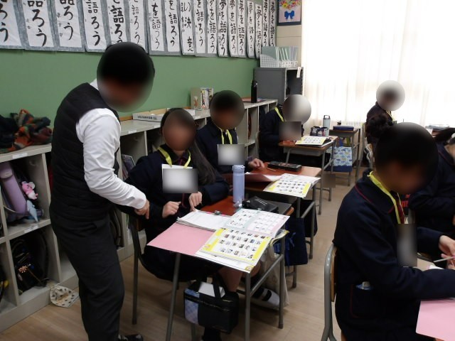 6年生は外国語の学習です。中学生になって入りたいクラブをたずねる"What club do you want to join?"に対して、"I want to ~."や"Why?"、"Me,too."などを使って、英語で伝え合う練習をしました。