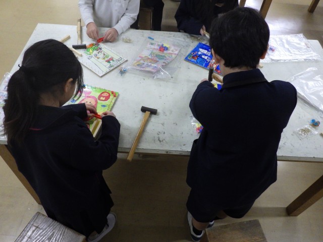 図画工作科で「くぎうちビー玉ゲーム」を制作しています。はじめてくぎ打ちに挑戦する子どもも多く、最初はおっかなびっくりでしたが、少しずつ慣れて、上手にくぎが打てるようになってきました。安全に気をつけて、最後まで丁寧に作業を進めていきたいと思います。