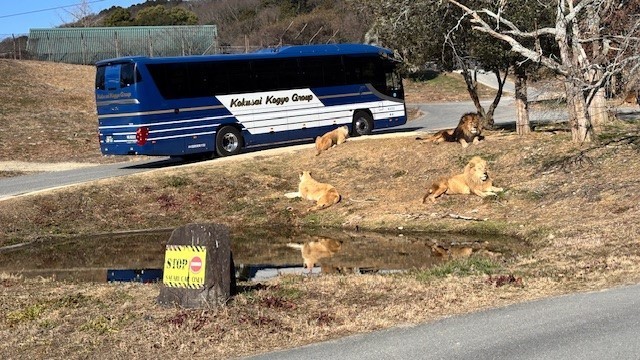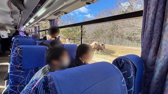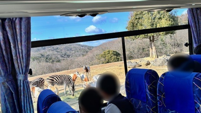 6年生は卒業遠足で姫路セントラルパークに来ています。到着して、バスはそのままサファリパークに入っていきました。車の中から放し飼いにされている動物を子ども達は興味深く見ています。