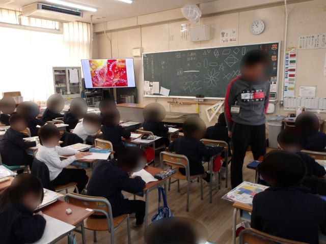 2年生は図工でスチレンはんがを制作します。この作品はスチレンボードにあとをつけて、インクをつけて刷ります。制作キットを開けてどんな作品を作るのか構想を練りました。