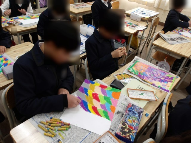 3年生は図工の学習です。国語の物語文「モチモチの木」から心に残ったシーンを絵に描きます。今日は、スクラッチングの技法を使って光を表現するため、パスを塗り込んでいきました。