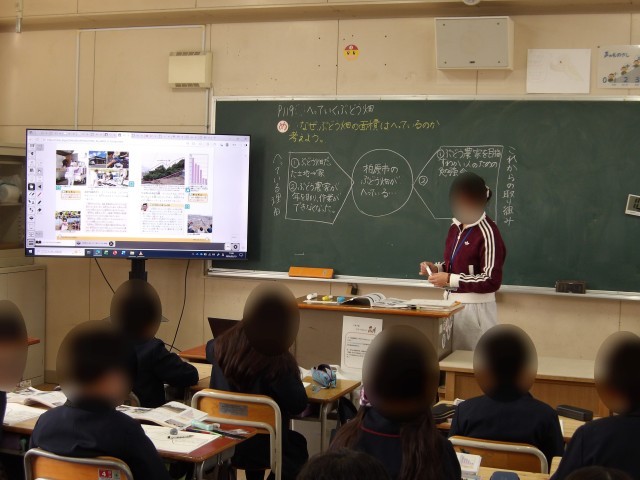 4年生は社会の学習です。柏原市のぶどう作りについて調べました。ぶどう農家は、減少傾向にあったのですが、調べてみると近年はぶどう作りをする若者の育成や機械化が進み、徐々に息を吹き返していることがわかりました。