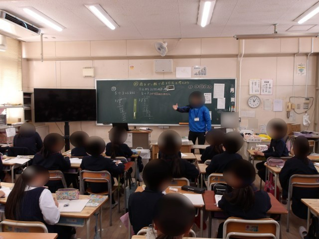 4年生は算数の学習です。小数のわり算でわりきれないときに概数で表す練習をしました。「上から2けた」「10分の1」といった言葉に着目して、どの位を四捨五入するか考えました。