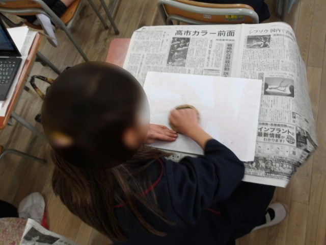 図工科で、スチレン版画に取り組んでいます。スチレンボードにインクをつけて、刷っています。刷った紙をめくると「きれい!!」と、驚き喜ぶ声も聞かれました。1色ずつ色を塗り重ねていきます。