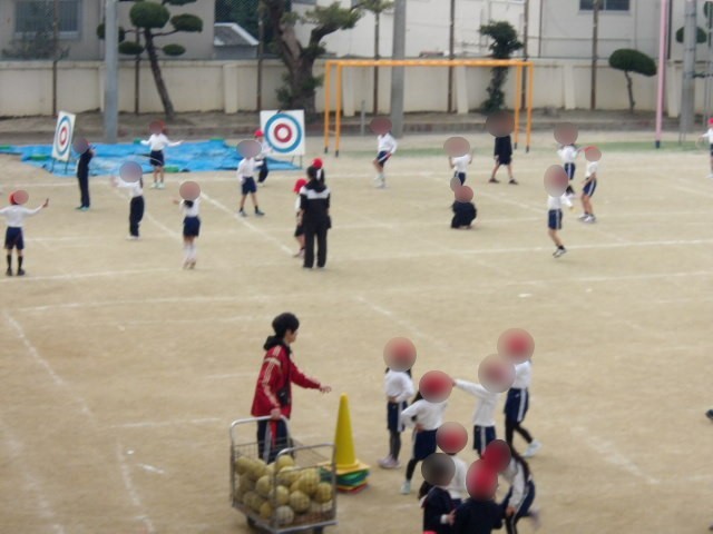 1年生は体育の学習です。なわとび練習とボール蹴りをしました。なわとびは、練習するにつれ、とても上達しています。ボール蹴りは、間隔を空けて、強さや方向を意識して蹴る練習をしました。