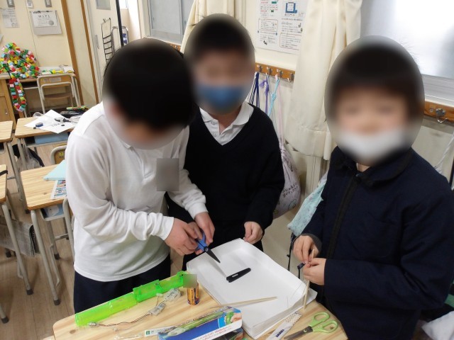3年生は理科の学習です。これまで学習してきたことを活かしておもちゃづくりをします。グループになって実験道具を手に取りながらおもちゃのアイデアを交流しました。