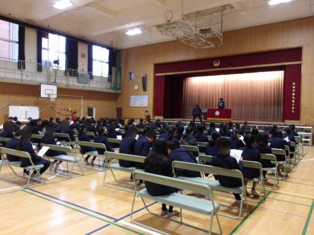 6年生は講堂にて卒業式の練習が始まりました。自分の座る位置、起立、着席、礼といった基本的な動作を確かめた後は、卒業式の流れを確認しました。いよいよ最後の学校行事です。堂々とした姿で式を迎えてほしいと思います。