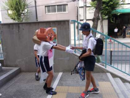 運動会まであと少しとなりました。あいさつ運動に、児童会のキャラクターのうめくまさんと梅友ヒーローが登場しました。