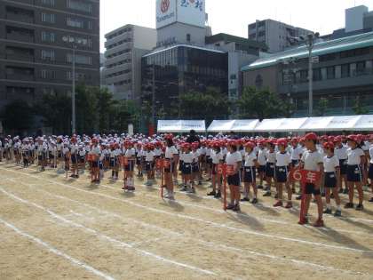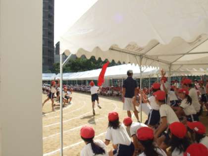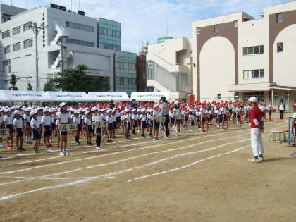 運動会全体練習(1日目)で、入場行進、開会式、応援合戦(ウェーブ)をしました。