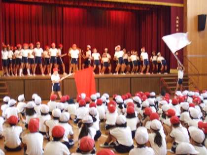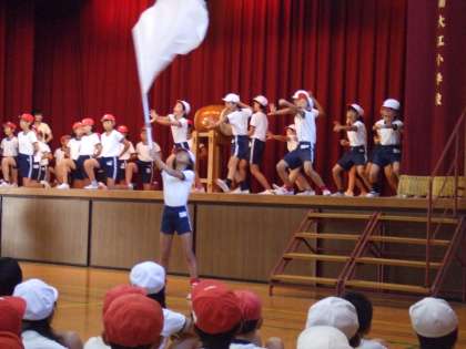 運動会全体練習3日目は、体育館で運動会の歌や足踏み、応援合戦(声出し合戦)などをしました。