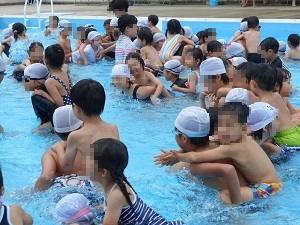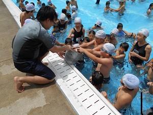 大きなプールに驚いたのか、初めは泣いている園児さんもいましたが、5年生の皆さんが手をつないで優しく声をかけてあげたり、水の中で抱っこしてあげたりすると、すっかり笑顔になりました。そして、おんぶでプールの中をお散歩したり宝探しをしたりして、とても楽しく活動することができました。