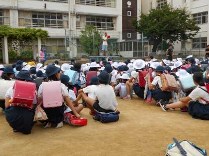 災害時や緊急時に、地区班の児童が集まって集団下校することがあります。