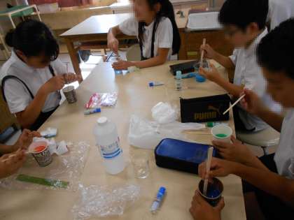 科学クラブは、好きな色のスライムを、楽しそうに作っていました。