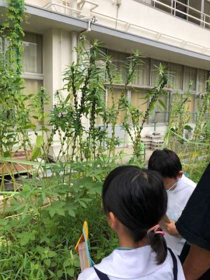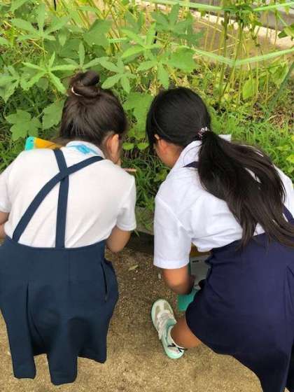 シジミチョウ、ハチ、ダンゴムシ、ヤスデ、セミなどを見つけ、詳しく観察しました。