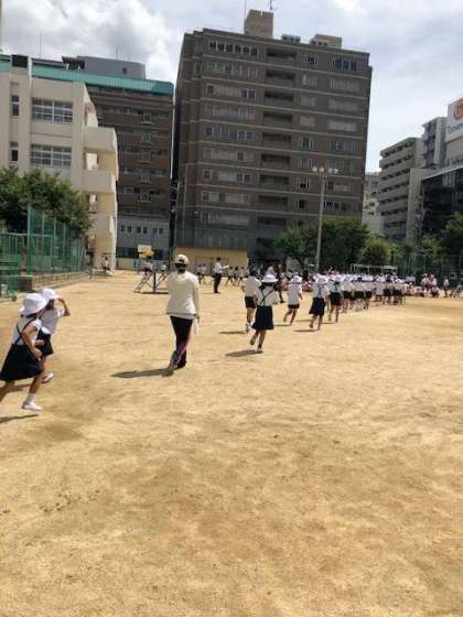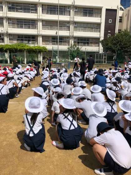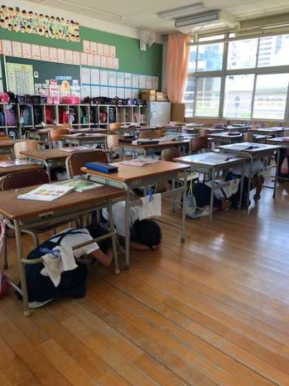 地震が起きた合図ですぐに頭を保護し、揺れがおさまるのを待ちました。揺れがおさまり、避難経路の安全が確認できたという合図で、運動場に全校児童が避難しました。先生の指示をしっかりと聞き、素早く行動出来ました。