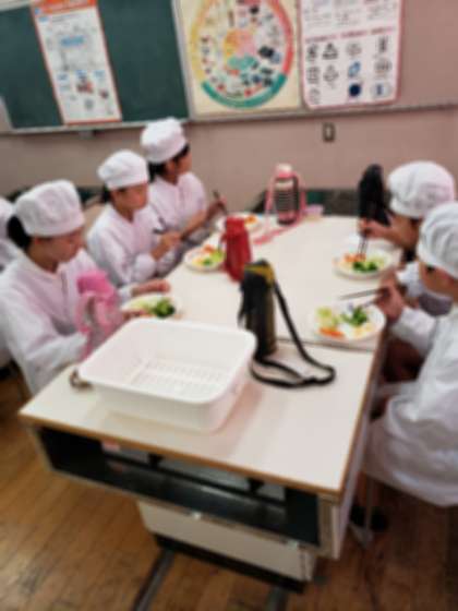 5年生が家庭科の学習で調理実習をしました。今回は野菜や卵をゆで、サラダをつくりました。