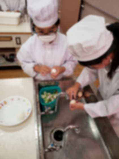 また、ゆで玉子を初めて作った子どももおり、上手な子の手つきを見ながら殻むきをしていました。