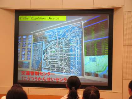 広報コーナーで警察官の仕事のビデオを見たり、話を聞いたりしたあと、通信指令室や交通管制センターを見学させていただきました。たいへん貴重な学習ができました。