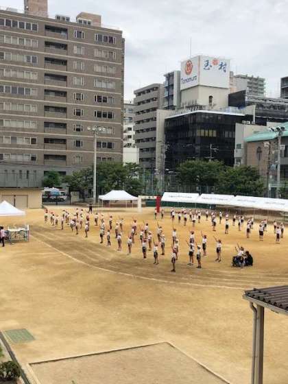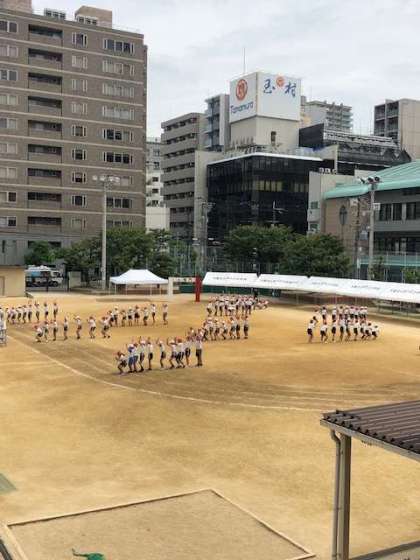 5年生の団体演技は、複雑な動きを身体いっぱいに使って表現します。隊形移動もさすが高学年。みんなでどう表現するのかを意識して一人一人が動いています。