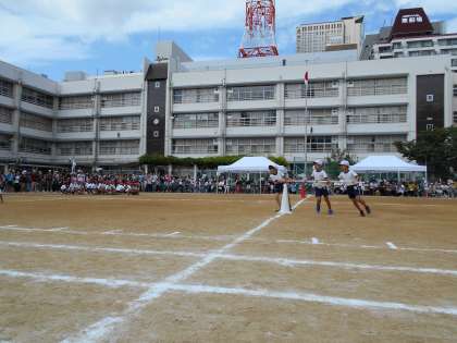団体競技の「力を合わせて」では、それぞれのグループで作戦を考えました。内側で棒を回す人と外側で速く走る人を考えたり、棒をくぐる時や跳び越す時にどうすればスムーズにできるのかを考えたりしました。本番では、僅差で赤組が勝利しました。
