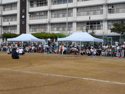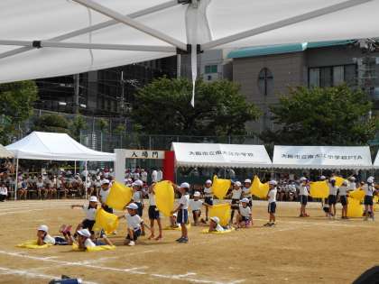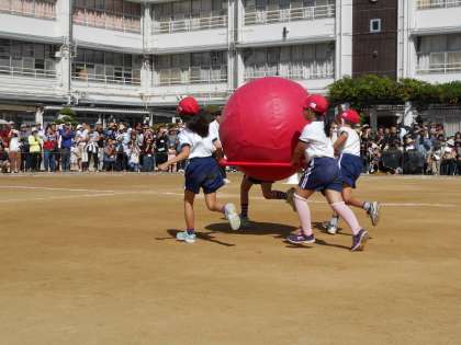 団体演技のダンスでは、はじめは少し緊張気味でしたが、4色のカラービニル袋をいろいろな形に変え、楽しく踊りました。ポーズもきれいにきまりました。大玉運びでは、練習では一度も落とさなかったものの、本番ではあせりがあったせいか、ハプニングもありました。でも、最後までよく頑張りました。かけっこは、ゴールを目指して一生懸命走りました。他の学年の演技や競技も、興味をもってよく見ることができました。