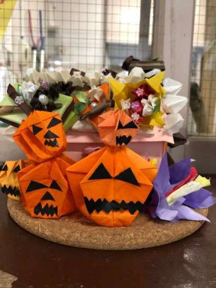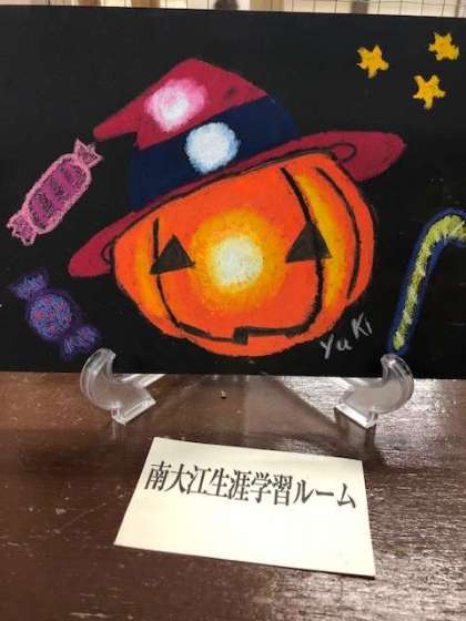 正門を入ってすぐのところに、素敵なハローウィンの飾りを置いています。これは、南大江生涯学習ルームの方が作ってくださった、手作りの飾りです。よく見ると、とても細かなところまで手がこんでいて、とてもかわいいです!