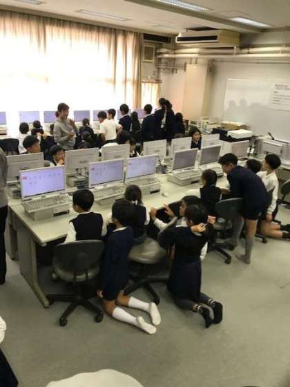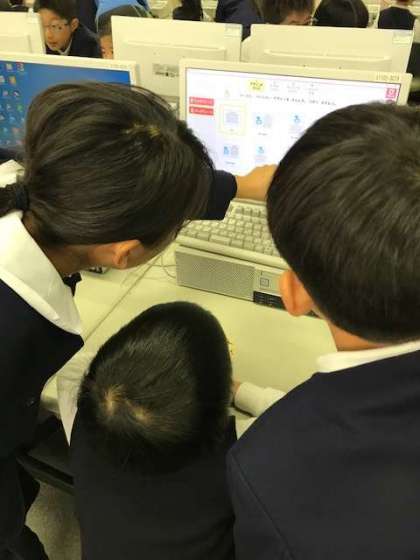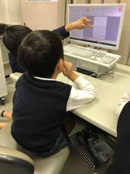 銅座幼稚園のそら組、もり組の子たちが来て、4年生と一緒にパソコンを使ってカレンダー作りをしました。