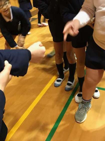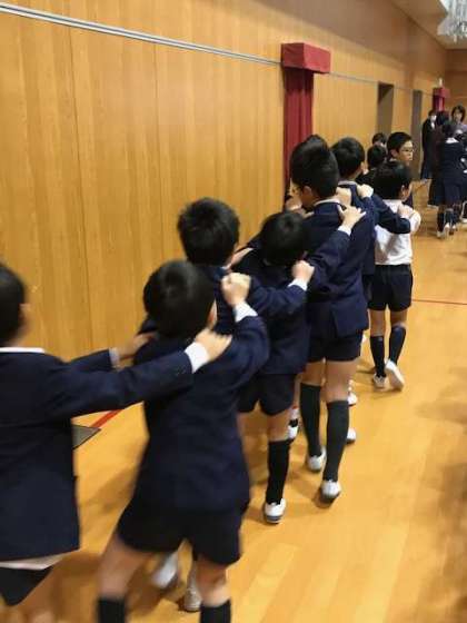 ちがう学年の子同士、肩に手を乗せて一列になって、体育館の中を歩きまわり、歓声が響き渡ってました。