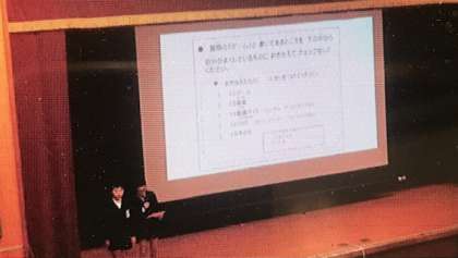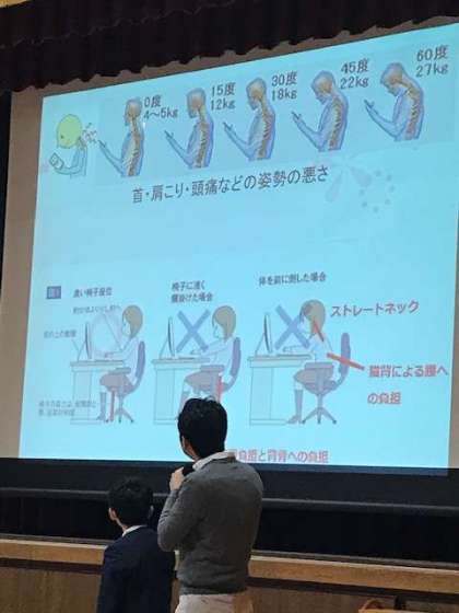 その後学校歯科医の先生から、歯、姿勢、唾液等についてのお話がありました。映像や実演も入れながら、とてもわかりやすくお話しいただきました。