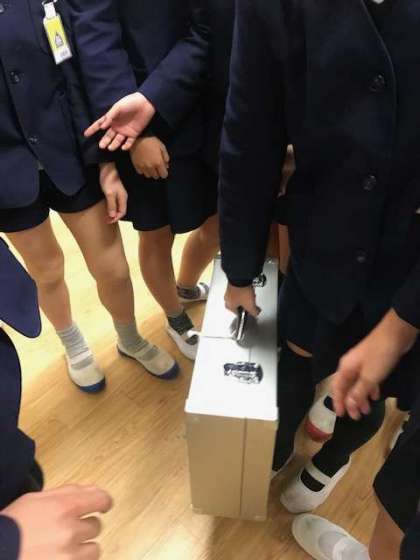 授業後は、1億円のレプリカが入ったアタッシュケースを持たせてもらい、ちょっと興奮気味の子どもたちでした。