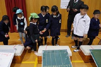 23日(木)の5時間目は、保幼小交流会がありました。南大江保育所、銅座幼稚園の年長児を招いて、おもちゃランドを開きました。