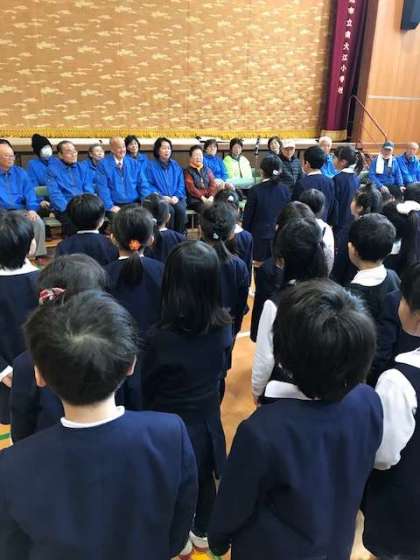 地域の方々が30人程来られて、いちねんせいに昔遊びを教えていただきました。「クリーン作戦隊」として、登下校の見守りをされている方々もおられます。