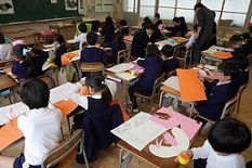 先月の図画工作科の時間から、子どもたちは紙版画に取り組みました。1年生の時、カラータック版画の経験はありますが、紙版画の経験はありません。そこで、紙版画とはどういうものなのかを、説明しました。