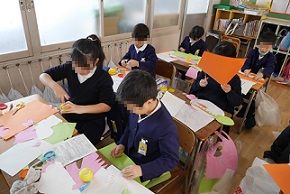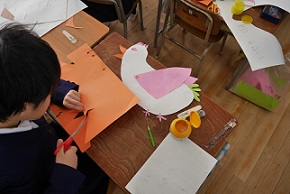 今回は、『鳥』をテーマに作品を作っています。「どんな鳥にしようかな。」「かわいい小鳥にしよう。」と、子どもたちは、自分が作りたい鳥をデザイン画(紙)に描きました。デザイン画を見ながら、画用紙に大きく鳥の体を描き、ハサミで切っていきます。羽、くちばし、足と作っていくうちに、「先生、デザイン画の絵と少し変わっていいですか?」と、自分が作りたい鳥のイメージを想像しながら鳥を制作していました。「目をハートにしてもいい?」「体にクローバーのもようをつけよう。」と、楽しそうに取り組んでいました。