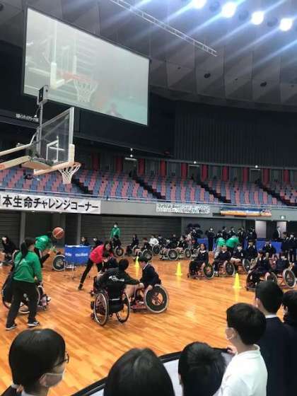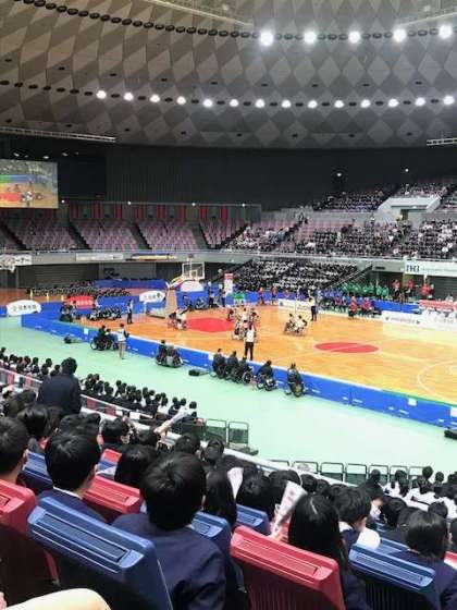 5年生が国際親善女子車椅子バスケットボールの観戦です。日本対イギリスの試合です。