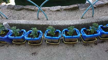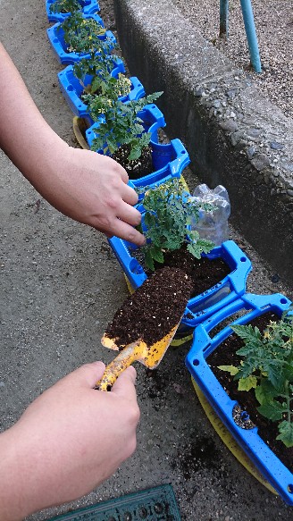 みんなの うえ木ばち 1つ1つに こころを こめて うえました。