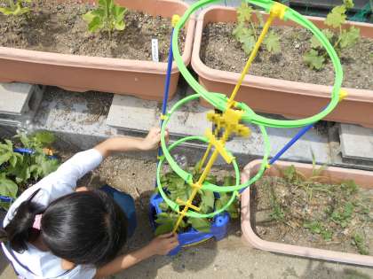 水曜日には、あさがおを育てている植木鉢に、支柱を立てました。